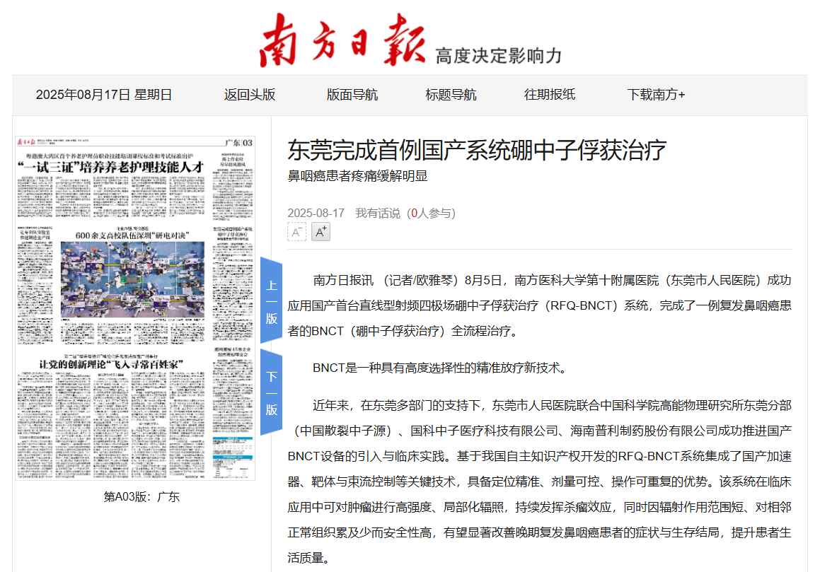 东莞市人民医院成功应用国产首台直线型射频四极场硼中子俘获治疗(RFQ-BNCT)系统,完成了一例复发鼻咽癌患者的BNCT全流程治疗,标志此种癌症治疗新手段完成了首例临床应用。